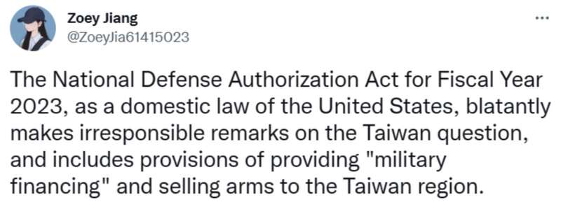 网友@Zoey Jiang表示,2023财年国防授权法案法作为美国的国内法,却在台湾问题上公然说三道四,还包括向台湾地区提供“军事资金”、销售武器等条款。