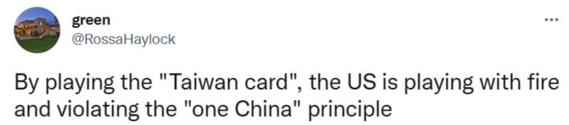 网友@green表示,美方打“台湾牌”是玩火,违背“一个中国”原则。