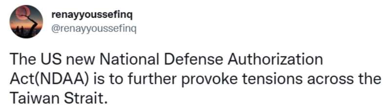 网友@renayyoussefinq认为,美国新的国防授权法案是在进一步挑起台海紧张局势。