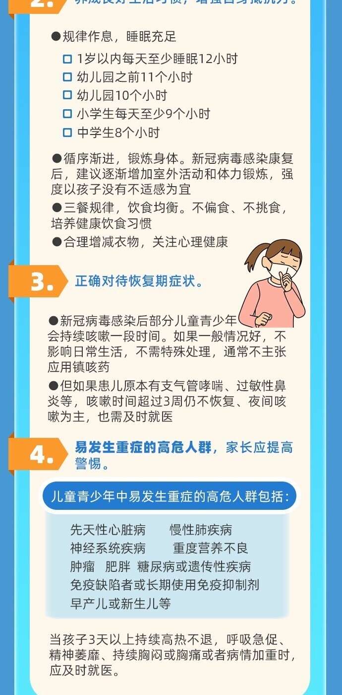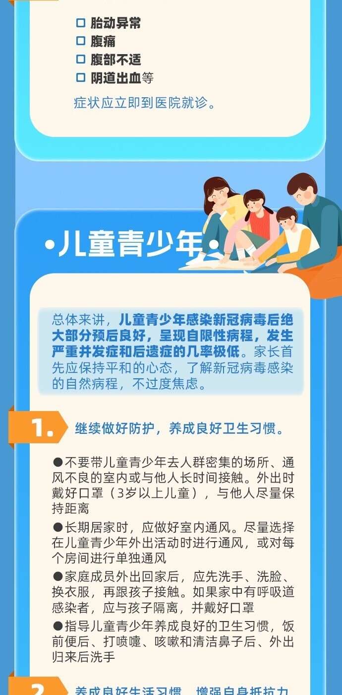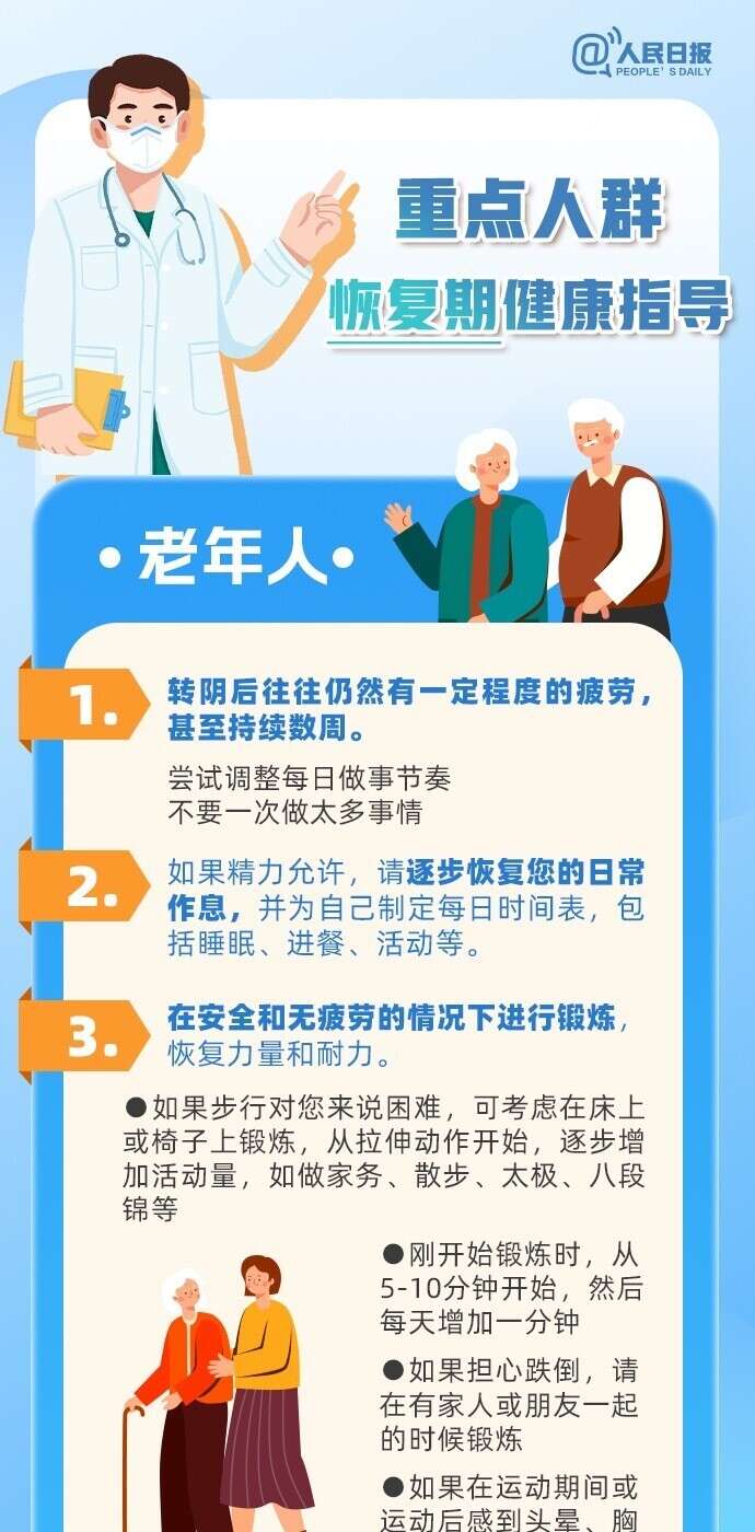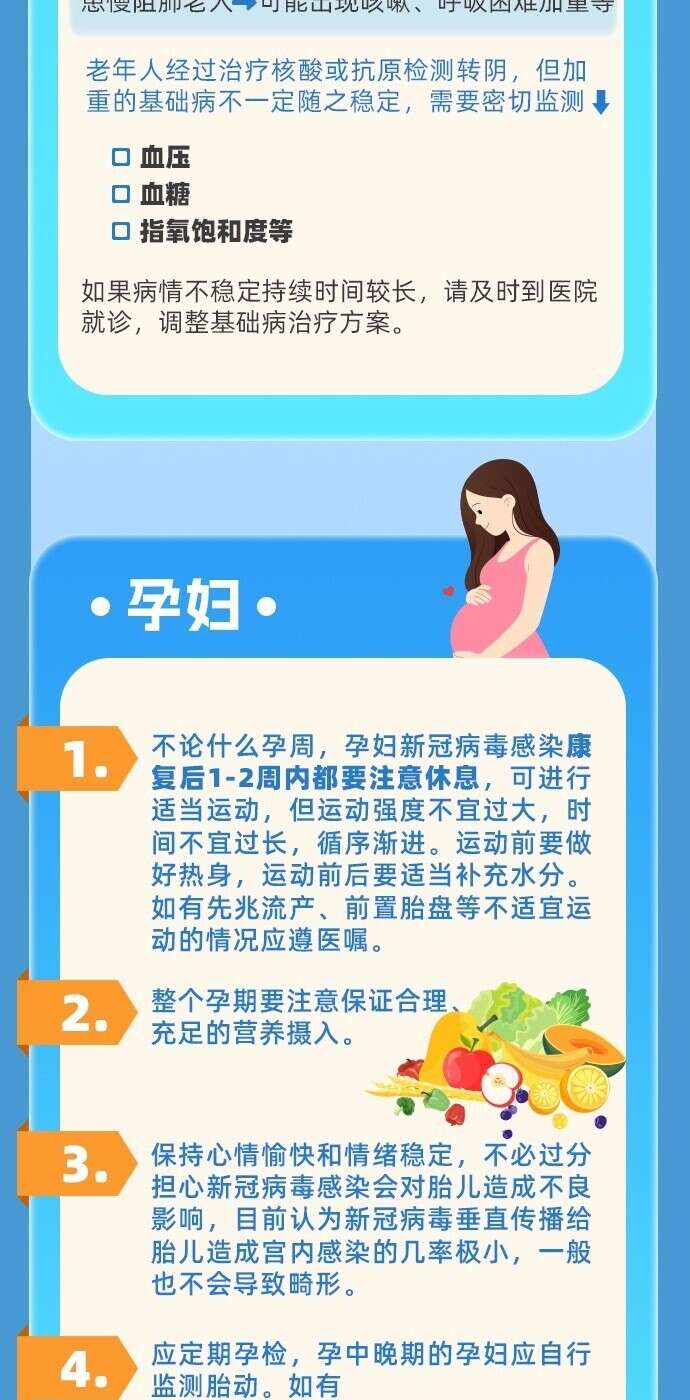 新冠病毒感染恢复期,虽然核酸、抗原检测结果已经转阴,但机体尚未恢复到病前水平,需要1到2周甚至更长时间才能完全缓解。老年人恢复期间需要注意哪些指标?孕妇出现哪些症状应及时就诊?哪些儿童青少年是重症高危人群?一图了解重点人群恢复期健康指导。