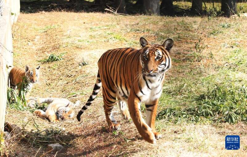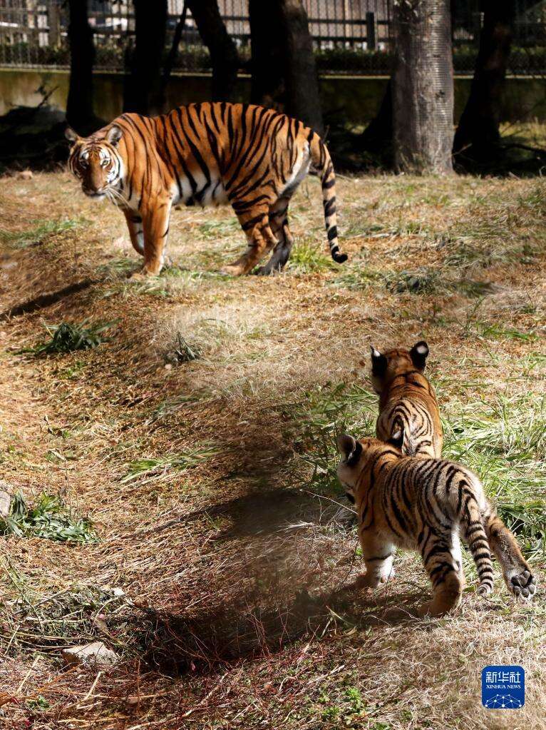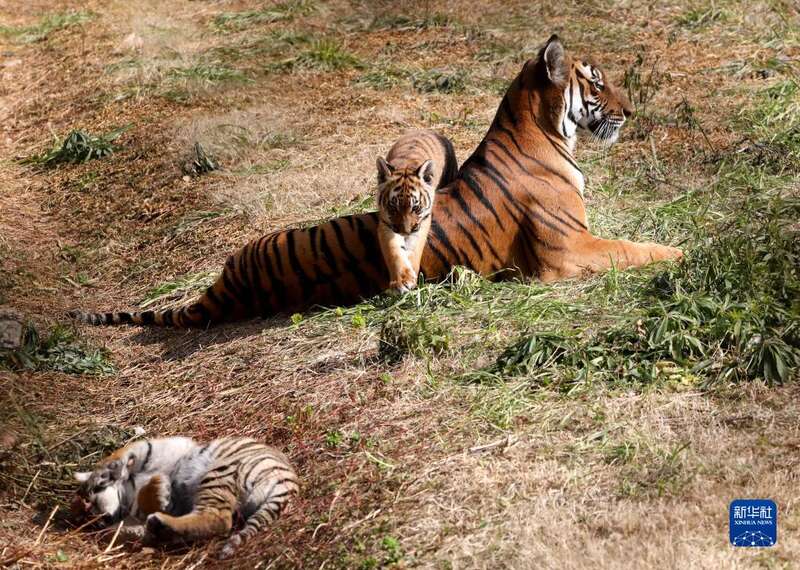 12月31日,在中国华南虎苏州培育基地,双胞胎小华南虎与虎妈妈在一起。