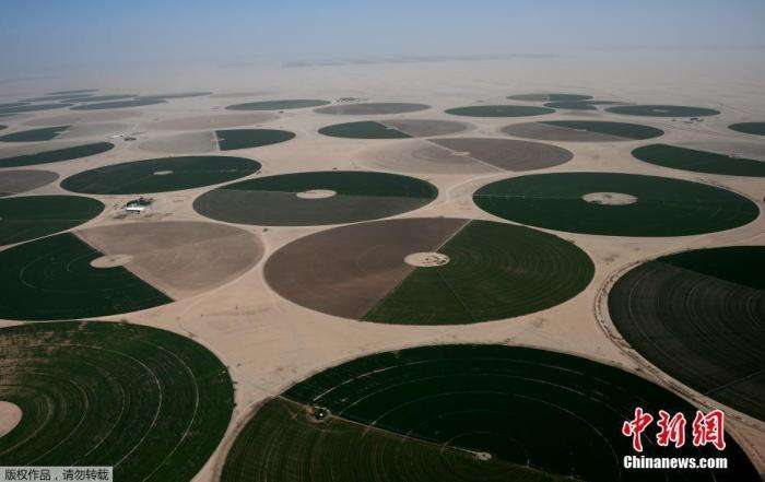资料图:航拍沙特东北部沙漠瓦迪达瓦西尔,圆形田野点缀其中。