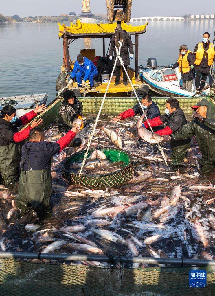新年临近,江苏省泰州市姜堰区溱湖6000多亩水域进入冬季捕鱼季,渔民们抓紧捕捞供应节日市场。