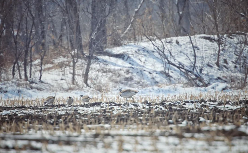 ▲2022年3月19日,北京通州水南村,一场春雪过后,四只大鸨在雪地里觅食。新京报记者 薛珺 摄