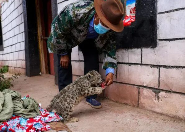 ▲2022年10月11日,已经退休的林周县农牧局工作人员格桑顿珠,在给被救助的雪豹幼崽喂食。图/新华社