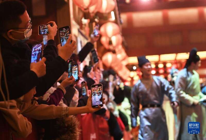 2022年12月31日,游客在长安十二时辰主题街区观看表演。