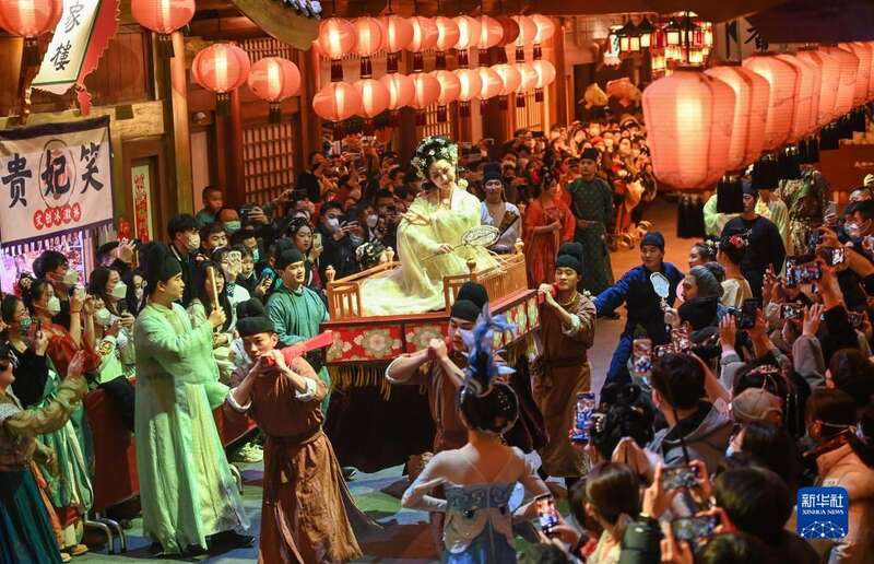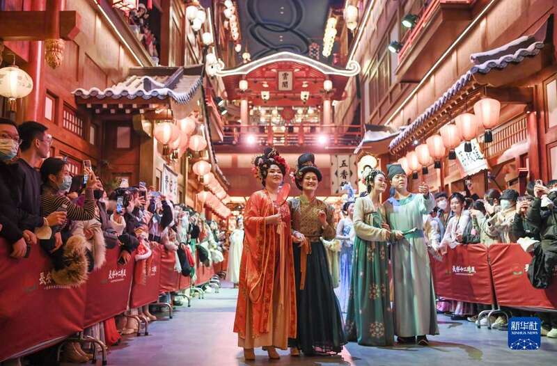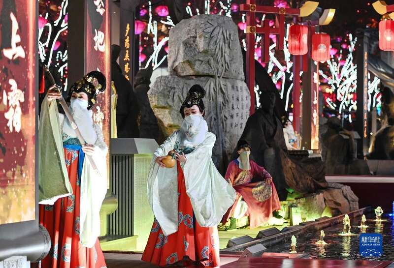 2022年12月30日,演艺人员在大唐不夜城步行街表演。