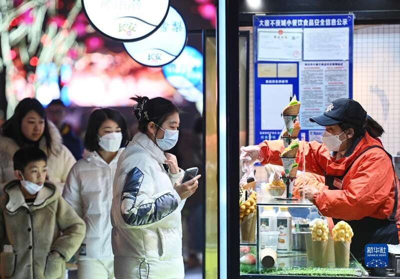 2022年12月30日,游客在大唐不夜城步行街选购小吃。
