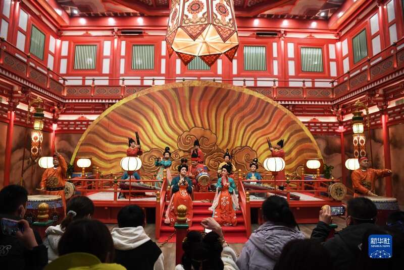 2022年12月31日,游客在长安十二时辰主题街区观看鼓乐表演。