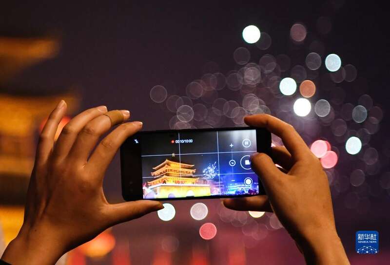 2022年12月31日,游客在钟楼前拍摄跨年烟花表演。