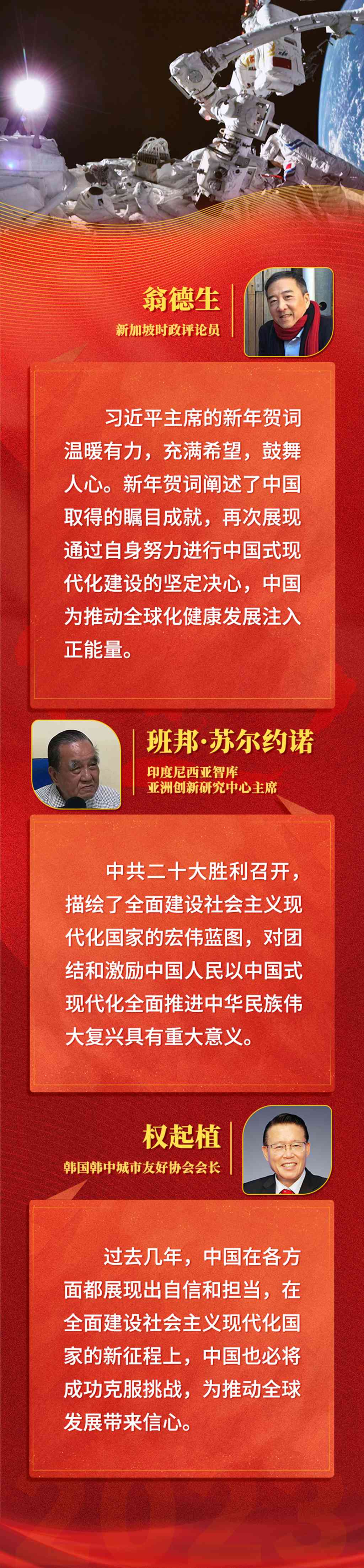 2023年,是中国全面落实中共二十大精神的开局之年,是全面建设社会主义现代化国家新征程起步之年。迈上中国式现代化道路,14亿中华儿女如点点星火汇聚成炬,迸发出昂扬向上的中国力量,继续书写自强不息、团结奋斗的新篇章。