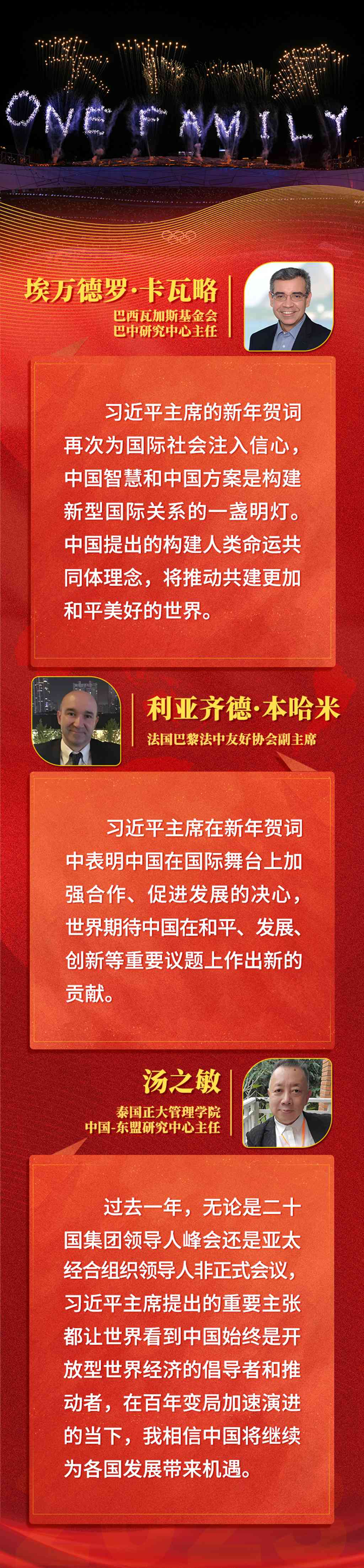 新年贺词深情回望中国人民在2022年走过的不凡道路、作出的伟大成绩,也提出了接续奋斗、让中国与世界更美好的殷切期望。温暖而有力的话语,通过电波和网络传向世界。