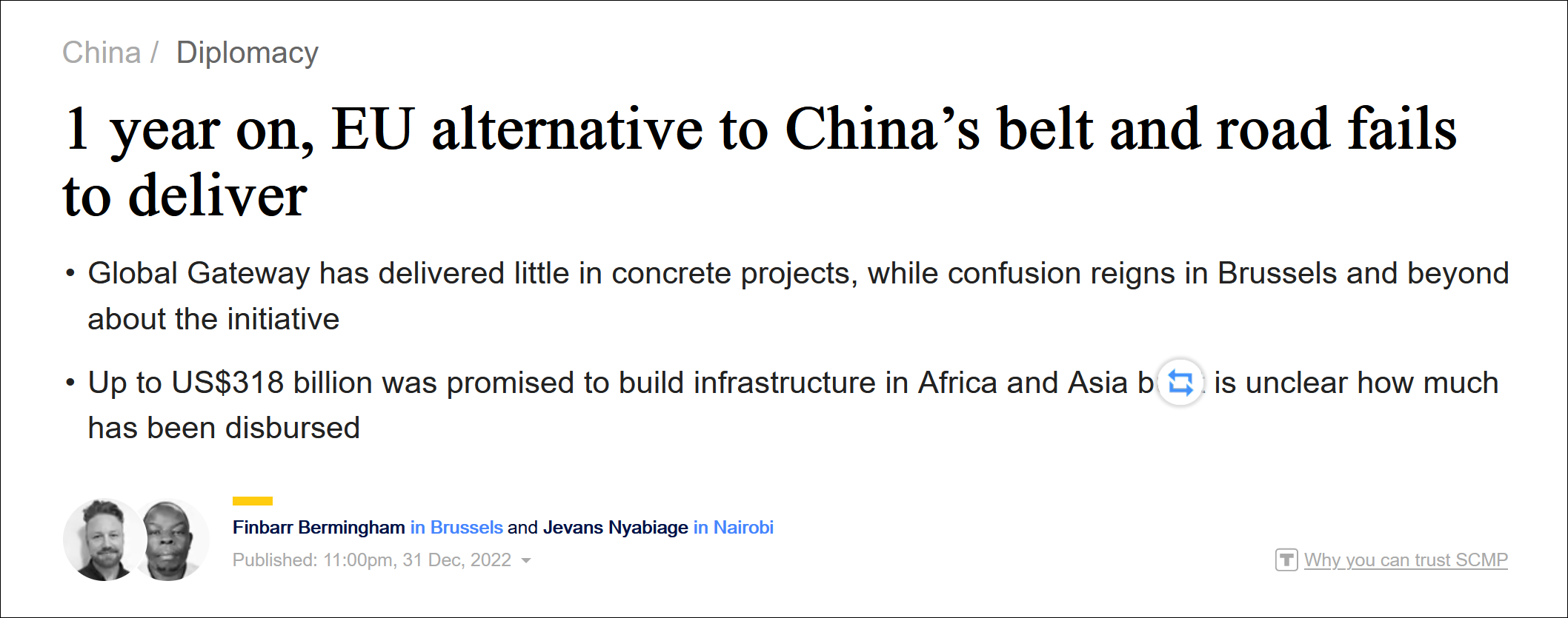 不仅未能实现,而且引发的失望和质疑声越来越大——香港《南华早报》在12月31日的文章中做出了如此评价。文章注意到,尽管欧盟委员会主席冯德莱恩2021年末宣布该计划时信心满满,并对此大肆宣传,但至今在具体项目的落实上几乎没有进展。这种结果与缺乏资金投入,乃至欧盟令人困惑的做事方法有关,这不仅引起了欧洲内部人士质疑,也招致了外界的抨击和讽刺。