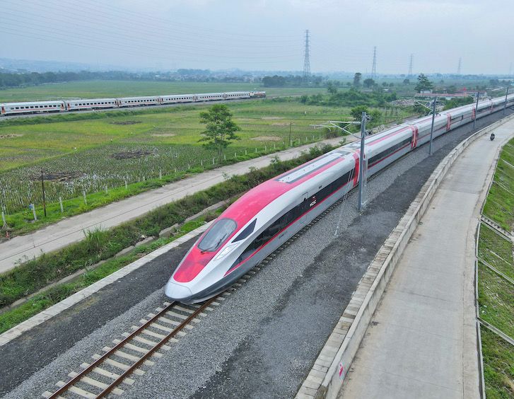 在印尼西爪哇省万隆市,一列高铁动车组正在雅万高铁试验段进行热滑试验。雅万高铁是共建“一带一路”倡议和中印尼务实合作的标志性项目。(2022年11月9日无人机摄,新华社)