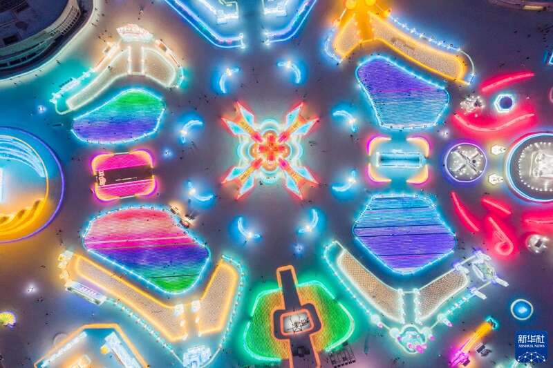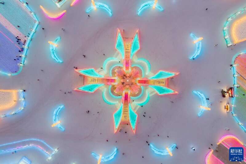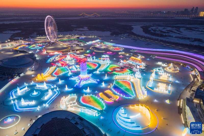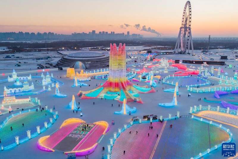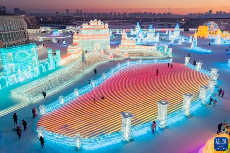 冬日夕阳下,第24届哈尔滨冰雪大世界园区流光溢彩,梦幻壮观,来自天南海北的游客在园区内畅享冰情雪趣。