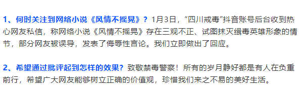 1、何时关注到网络小说《风情不摇晃》?1月3日,“四川戒毒”抖音账号后台收到热心网友私信,称网络小说《风情不摇晃》存在三观不正、试图抹灭缉毒英雄形象的情节,部分网友被误导,发表了侮辱性言论。我们立即做出了回应。