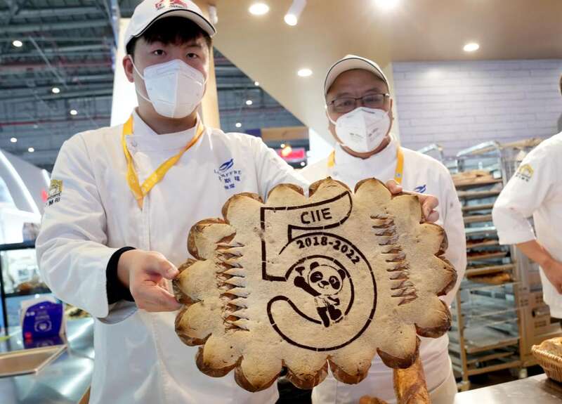 2022年11月7日,第五届进博会乐斯福展台的烘焙师展示为进博会特制的法式面包。在第五届中国国际进口博览会的食品及农产品展区,汇聚了世界各地的特色物产和美食,令人目不暇接。新华社记者刘颖摄