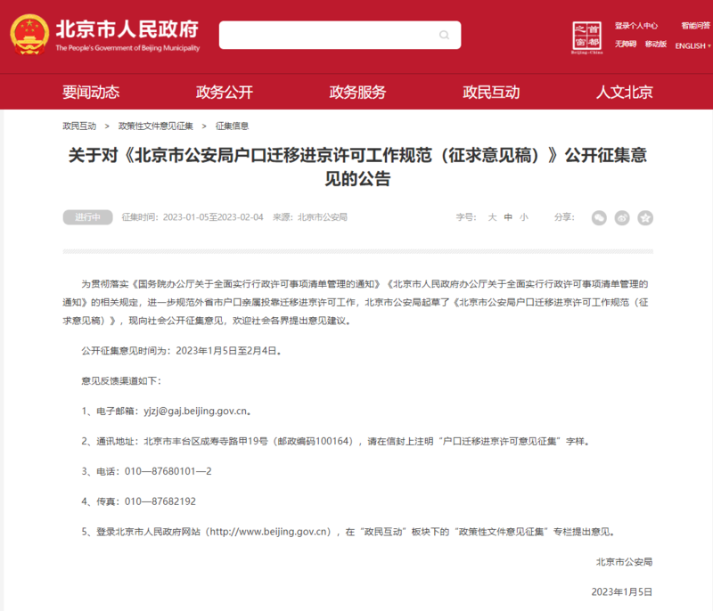 首都之窗网站刊登公告,对《北京市公安局户口迁移进京许可工作规范(征求意见稿)》公开征集意见。