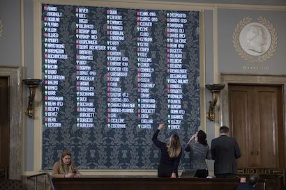 当地时间2023年1月4日,美国华盛顿特区,美国国会大厦众议院议长选举期间,会议厅墙上显示的投票结果。