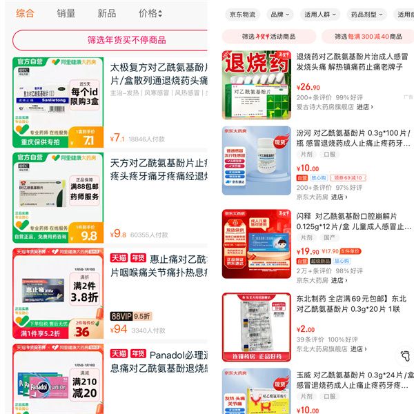 1月5日,记者在阿里健康、京东、1药网等平台上搜索布洛芬、对乙酰氨基酚,均有现货销售。比如,阿里健康上对乙酰氨基酚12粒售价9.8元,1药网上新华布洛芬片100粒/瓶售价29元,限购5件,京东平台上东北制药对乙酰氨基酚20片售价2元。