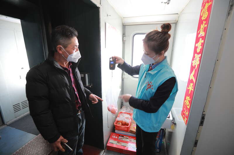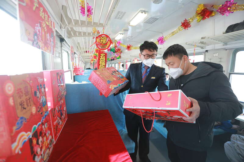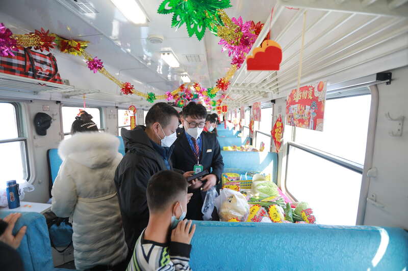 1月7日,为期40天的2023年春运开启,中国铁路哈尔滨局集团有限公司齐齐哈尔客运段把集市搬进了列车车厢。接下来10天,车上旅客尤其是沿线林区村民,在家门口的火车上就能“赶大集”,把年货带回家。