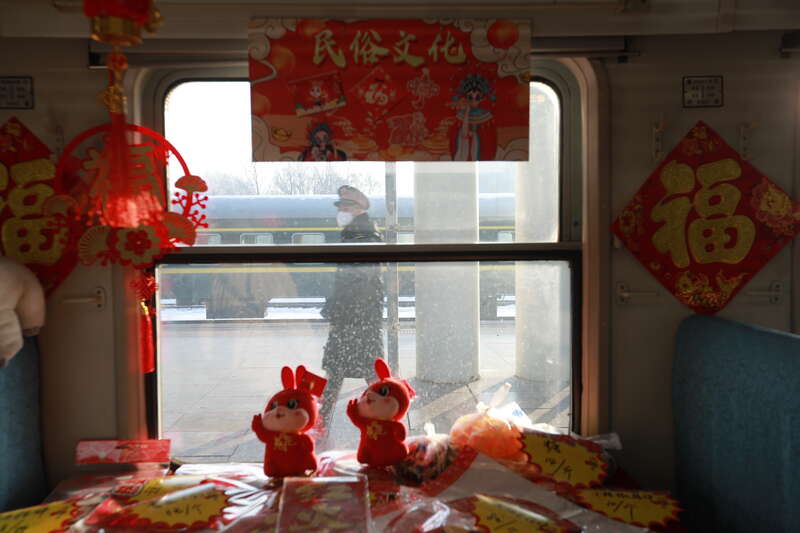 在民俗区,车厢里挂着福字、对联,摆着剪纸、玩偶,车厢外是雪地,两只红色的兔年玩偶靠在火车车窗上。一位母亲带着5岁的孩子在逛,“这不仅是孩子第一次乘坐火车,也是他第一次在火车上赶集。”这位母亲说。