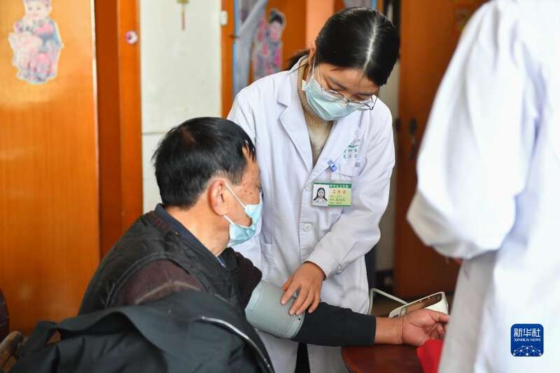 1月7日,医护人员在湖南省湘潭市雨湖区姜畲镇姜畲社区上门为老人测量血压。