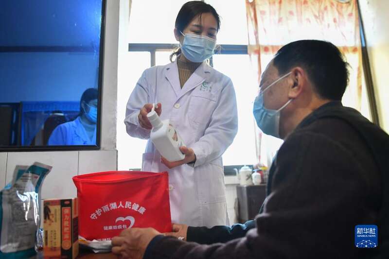 1月7日,医护人员在湖南省湘潭市雨湖区姜畲镇姜畲社区为老人讲解防疫健康包内的物品及使用方法。