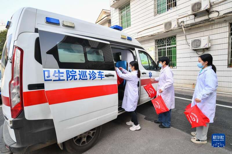 1月7日,在湖南省湘潭市雨湖区,医护人员将防疫健康包运送到巡诊车上。
