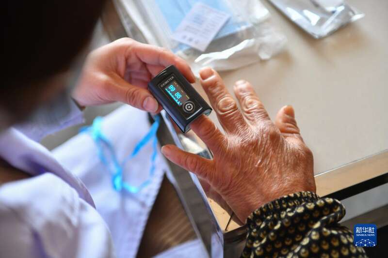 1月7日,医护人员在湖南省湘潭市雨湖区姜畲镇联映村为老人检测血氧饱和度。