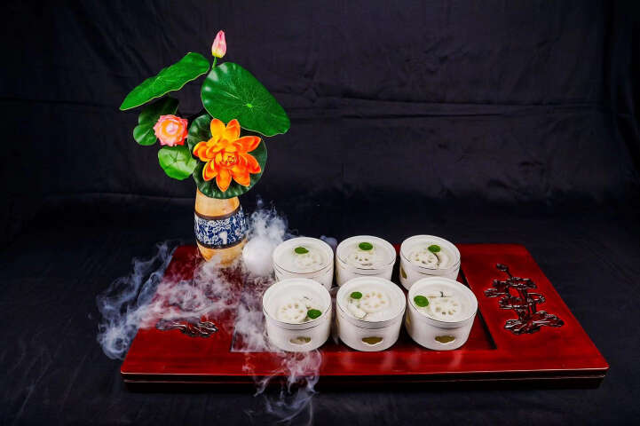 在干冰制成的云雾里,莲藕在洁白的瓷器里随着清汤摇曳,但取出品鉴却别有风味,彭钦红揭秘道:“这道热菜的原材料其实是鱼,逢年过节,鱼圆是湖北必不可少的特色美食,此道菜便是把鱼圆制作成莲藕和藕片的形状,配上清汤烹饪而成,达到‘吃鱼不见鱼’的境界。”