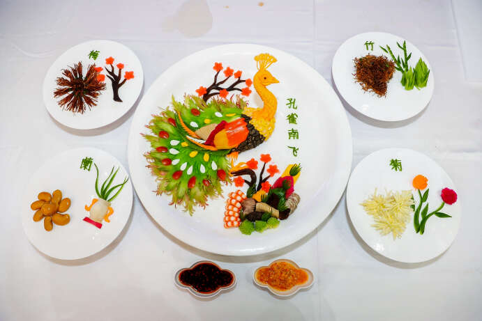 “做饭的原材料都是从当地带过来的,十分新鲜。”从云南远道而来的滇菜厨师刘福异在比赛现场带来了黑松露、羊肚菌、树花、牦牛干巴、乳扇等30多种特色食材,制作了艺术冷拼“孔雀南飞”和两道热菜,备受裁判好评。刘福异表示:“在云南,孔雀是吉祥的象征,将菜品拼成孔雀的形状也表达了对生活美好的祝愿。”