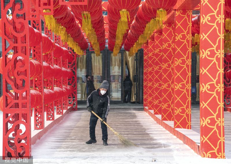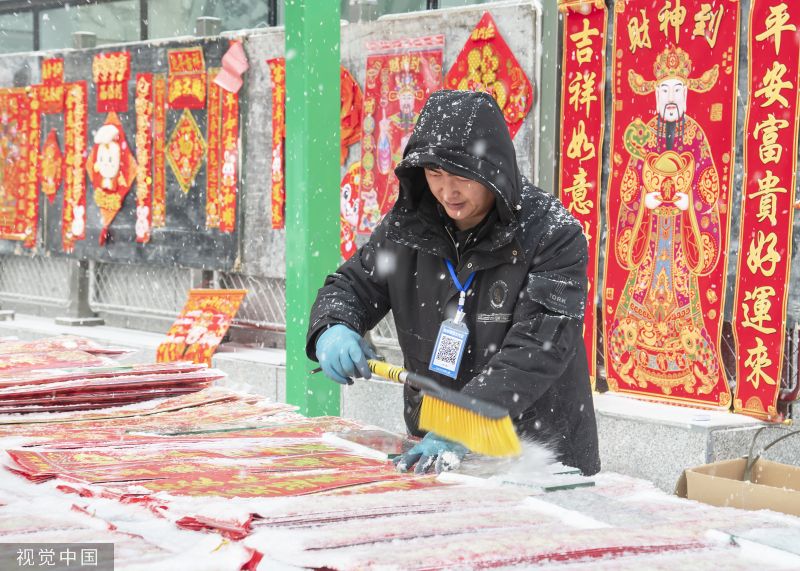 2023年1月8日,黑龙江大庆,商家摊位上扫雪。