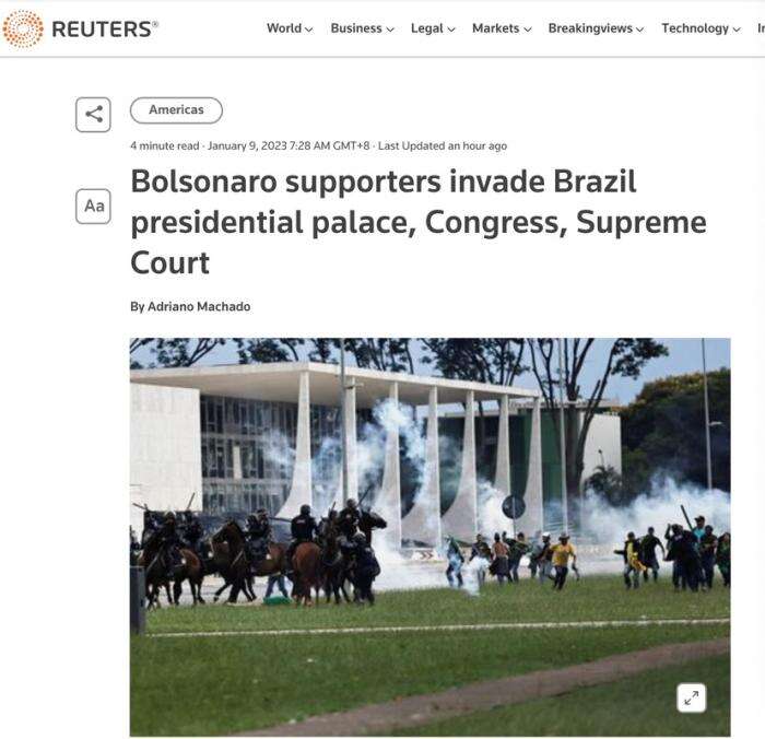 据悉,当时巴西总统卢拉正在圣保罗州访问。随后,卢拉下令国民警卫队进驻首都巴西利亚,以恢复秩序,并撤换了当地的公共安全负责人。