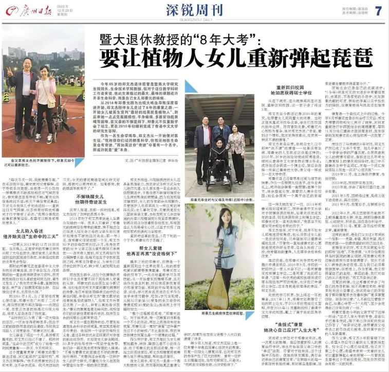 这位父亲名叫郑文杰。今年65岁的郑文杰退休前曾是暨南大学研究生院院长、生命科学技术学院教授,但对于这位教学科研工作者来说,他此生面临过的最大、最难的课题或许并非生命科学,而是自己女儿郑善元的疾病。