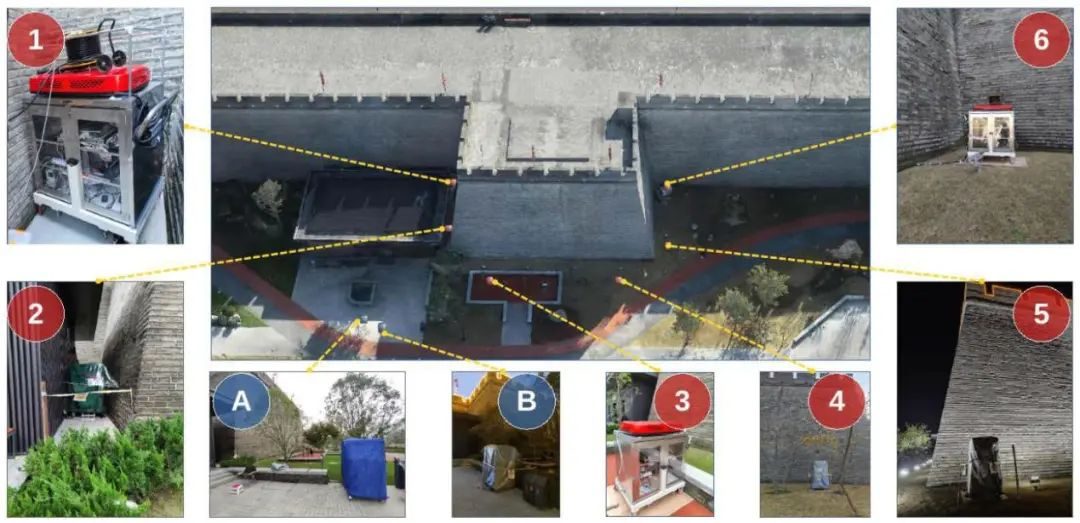 缪子成像探测仪器在西安城墙现场的实验布局。1-6号位置针对58号马面,A、B位置为空测位置。