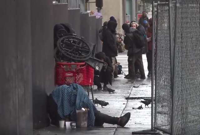 美国男子里奇·韦恩拍摄的画面显示,旧金山一座公交车站被毒贩和瘾君子霸占,成了露天贩毒市场。在那里,毒贩戴着口罩,从头到脚一身黑衣服,光天化日下进行毒品交易。瘾君子或蹲在街边吸毒,或情绪激动行为失常。