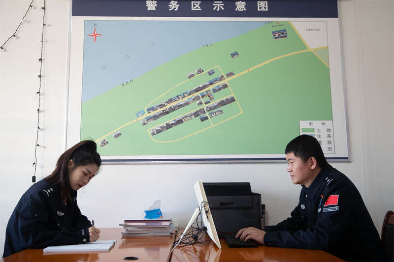 1月8日,史先强和妻子沈欣在洛古河夫妻警务室里进行信息录入工作。新华社记者 张涛 摄