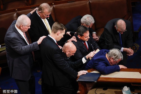 当地时间2023年1月6日,美国华盛顿特区,当选议员在众议院议长选举第四天开始前一起祈祷。