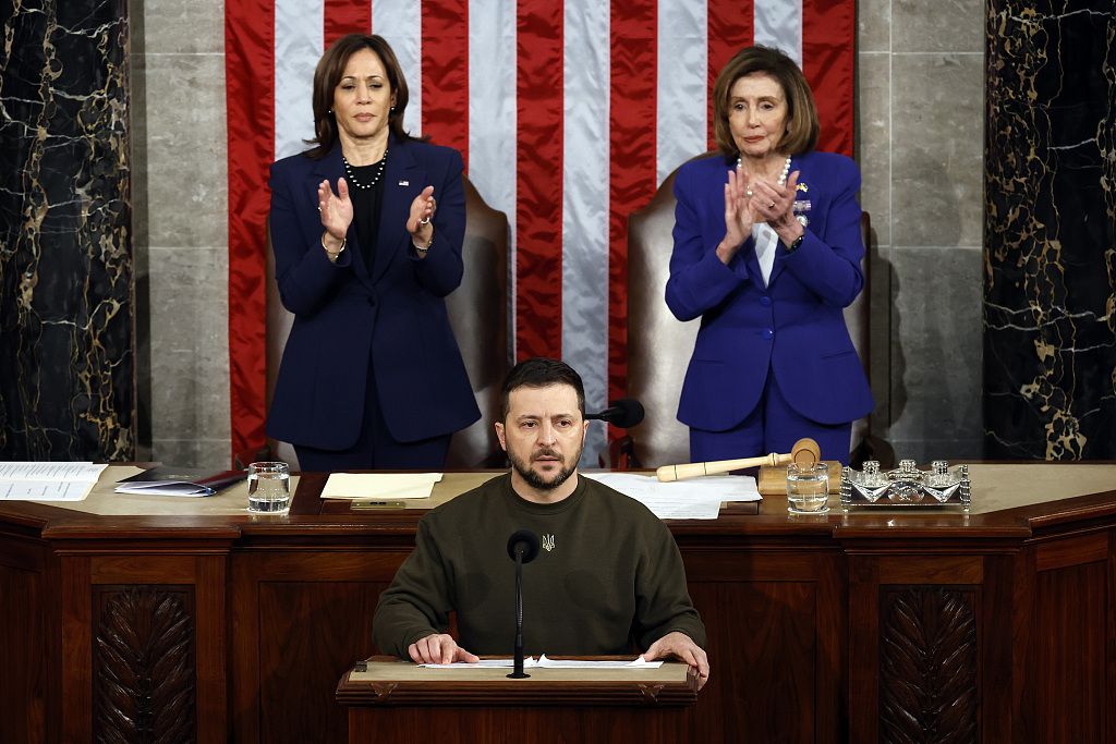 当地时间2022年12月21日,美国华盛顿特区,乌克兰总统弗拉基米尔·泽连斯基在华盛顿特区美国国会众议院会议厅举行的国会联席会议上发表讲话,美国副总统卡玛拉·哈里斯(左)和众议院议长南希·佩洛西鼓掌。视觉中国 资料图