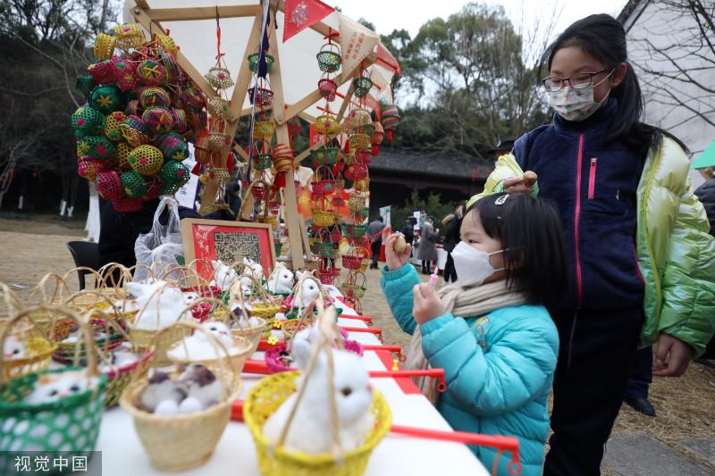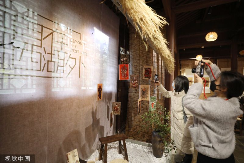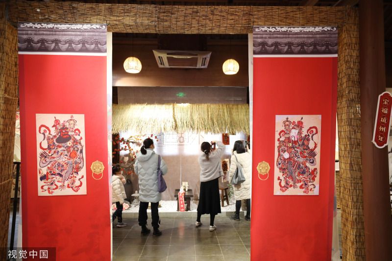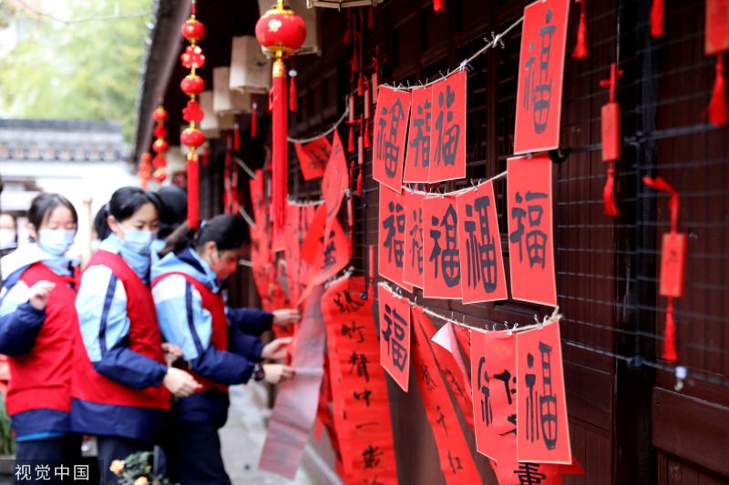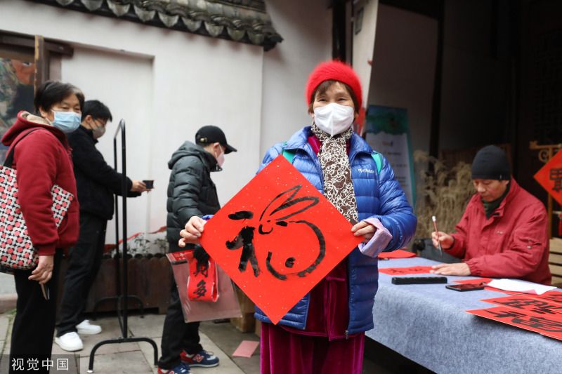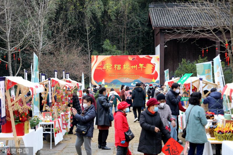2023年1月10日,杭州,“宋”福杭州年文化进万家暨西湖区第二届新春文化节活动在北山街道弥陀寺文化公园启动。现场有年味市集、写“福”字写春联、祈运挂“福”牌、门神画展等系列活动,热热闹闹,年味浓浓,熟悉的烟火气又回来了。