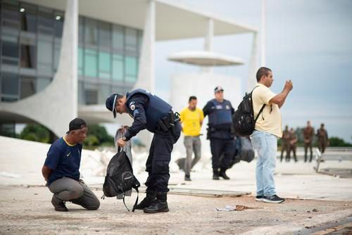 当地时间2023年1月8日,巴西巴西利亚,一名警察检查一名男子的背包,另一名警察押送一名被捕的前总统博索纳罗的支持者。这些暴力活动参与者此前突袭了巴西政府大楼。 视觉中国供图