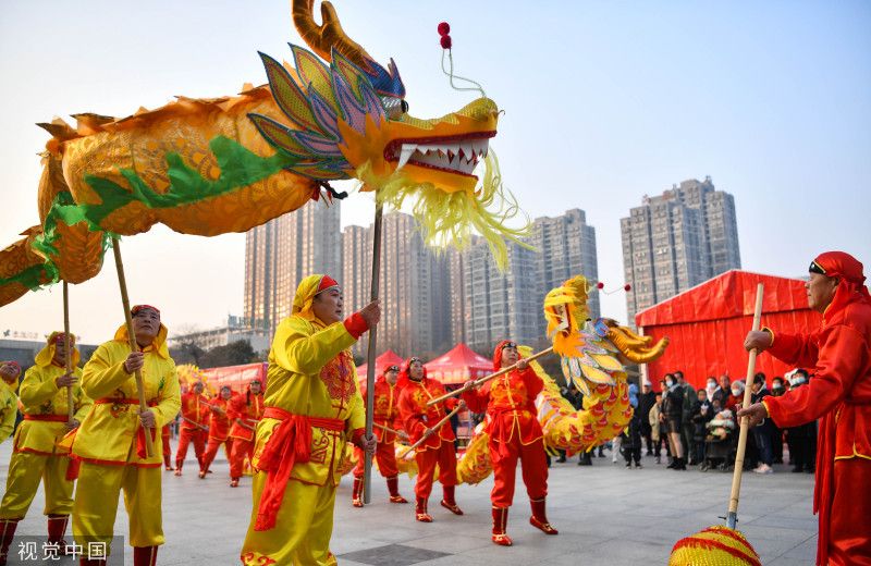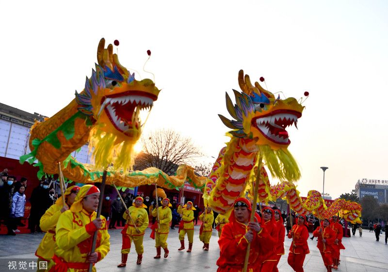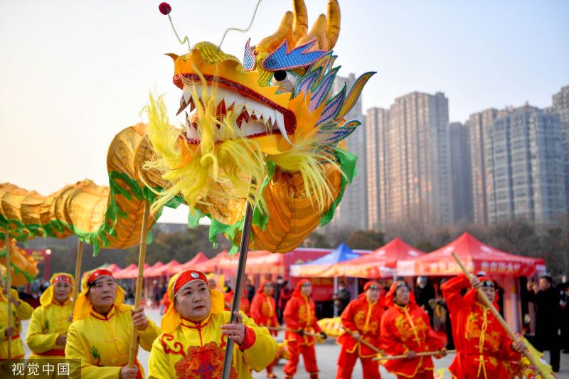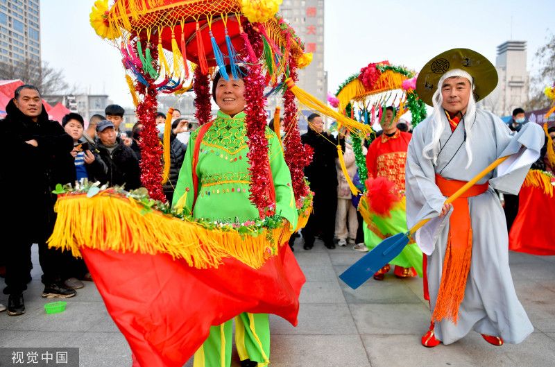 2023年1月11日,安徽亳州,民间艺人在谯城区魏武广场进行民俗表演。当日,安徽省亳州市组织民间艺人在魏武广场表演舞龙、跑驴、小车子旱船、大头娃娃、扭秧歌等精彩民俗节目,欢欢喜喜迎新春。
