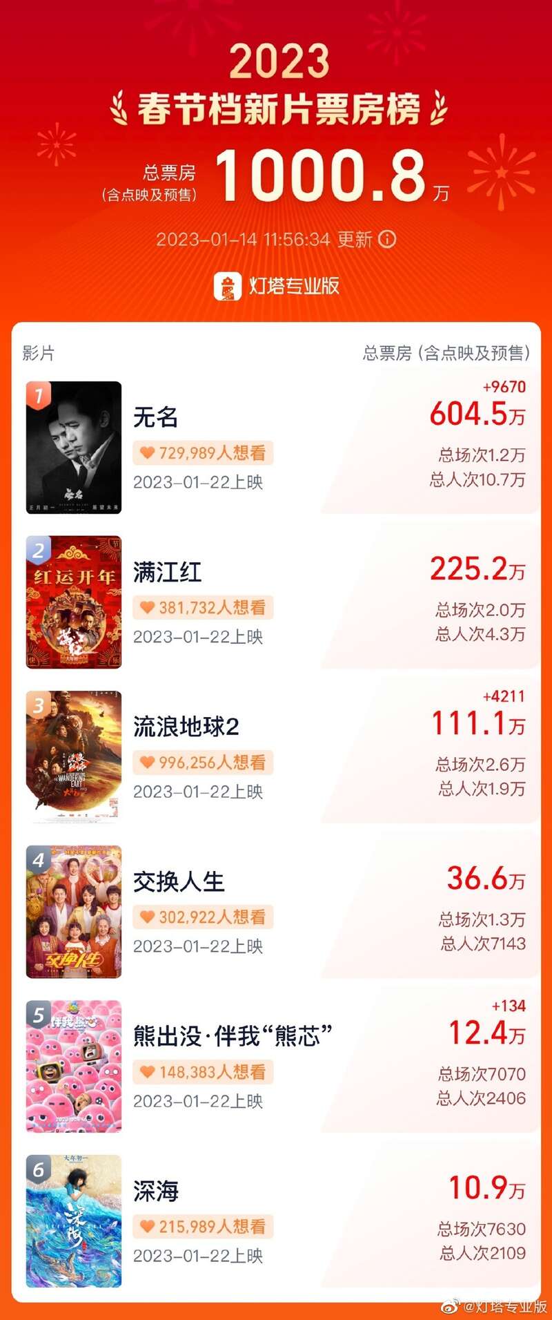 随着新冠疫情的第一波感染高峰过去,影院人流的回暖恰逢一年一度最大档期春节档的到来,看电影的“年俗”令电影行业逐步恢复信心。1月14日,春节档预售正式开启。《流浪地球2》《无名》《满江红》《交换人生》《深海》《熊出没·伴我“熊芯”》六部影片齐刷刷亮相。