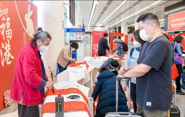 在剪纸、红灯笼、癸卯兔年等中国元素点缀的背景板前,长桌摆开、红纸铺就,来自福田区书画院的书法家和皇岗边检站爱好书法的民警并排而立,他们展纸伏案、挥毫泼墨,撰春联、写“福”字,隶楷行草各展所长,墨走龙蛇挥洒自如。一幅幅灵动秀逸、丰厚雍容、遒劲有力的作品从书法家们笔尖流出,浓浓的情意、真诚的祝福溢于字里行间,让旅客们喜笑颜开,大饱眼福,他们纷纷邀请书法家为自己定制寓意吉祥的春联。不少旅客掏出手机,对着不同形态的“福”字拍照集福。集齐“五福”的香港洪女士高兴不已,她说这个寒假给小孩报了书法班,希望书法可以带给孩子更多的中华文化体验。