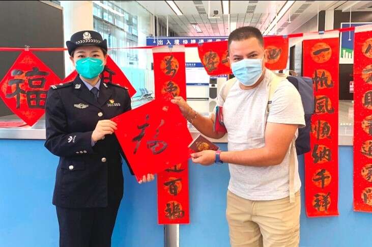 1月8日新冠病毒感染“乙类乙管”后移民管理优化政策措施正式实施以来,福田口岸成为深港首批恢复旅检通关和预约人数最多的重要陆路口岸。皇岗边检站民警不仅感受到旅客回家的激动心情,更感受到恢复通关带来多方利好。以“迎春送福·情暖深港”活动为契机,民警们发挥语言优势,竭诚为中外旅客讲起春联背后中国年的故事。