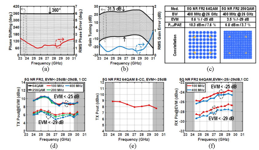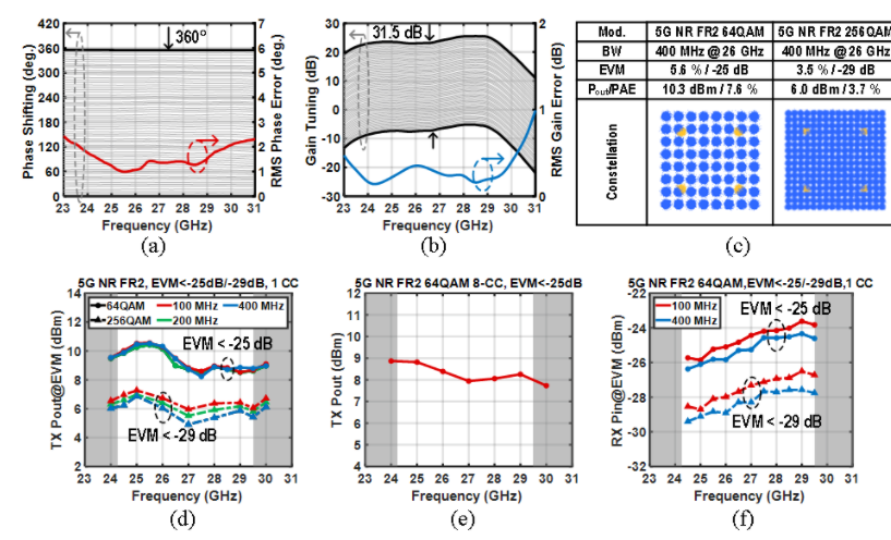 图2. (a) 6-bit 360° 移相测试结果;(b) 6-bit 31.5 dB调幅测试结果;(c) 26 GHz传输400-MHz 64/256-QAM OFDM信号测试;(d) 24-30 GHz发射100/200/400-MHz 64/256-QAM OFDM信号测试输出功率;(e) 24-30 GHz发射8×100-MHz 64-QAM OFDM信号测试输出功率;(f) 24-30 GHz接收100/400-MHz 64/256-QAM OFDM信号测试输入功率。