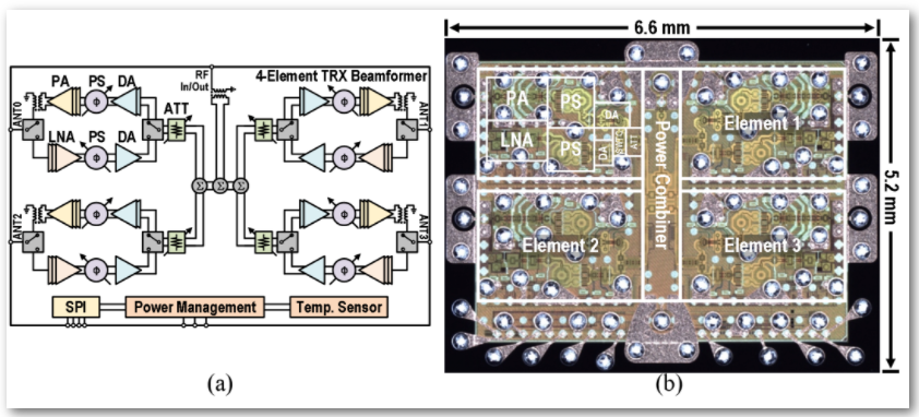 图1. (a) 5G毫米波四通道相控阵收发系统射频前端芯片系统架构;(b) 芯片显微照片。