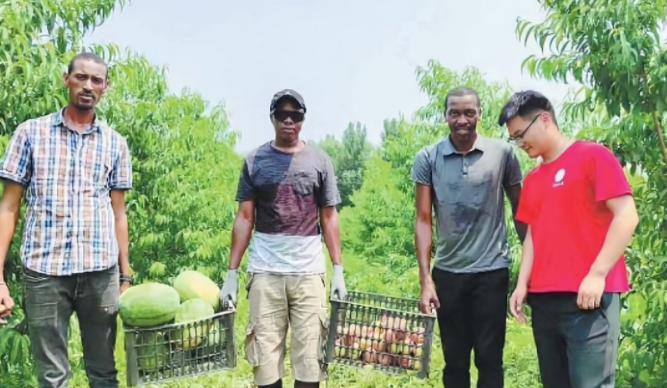 中非科技小院项目的三名非洲参与者在河北省曲周县一个农场采摘水果