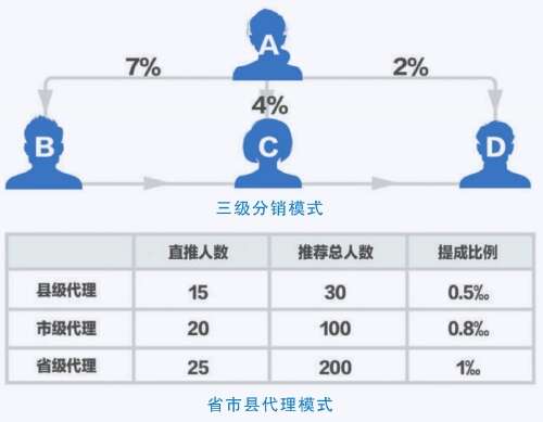 为了吸引更多人到公司投资,周某又设计了一套极具吸引力的拉人模式——“三级分销+省市县代理”模式。即A推荐B,A可提成B投资金额的7%,B再推荐C,A可提成C投资金额的4%,C再推荐D,A可继续提成D投资金额的2%;若推荐总人数分别达到30人、100人、200人,则分别成为县级、市级、省级代理,可再额外赚取提成。此外,公司还通过招商会、讲师讲课、播放宣传片、到公司考察报销食宿费用等方式大肆宣传到公司投资能返高利,鼓吹公司是十年企业,得到政府支持等。